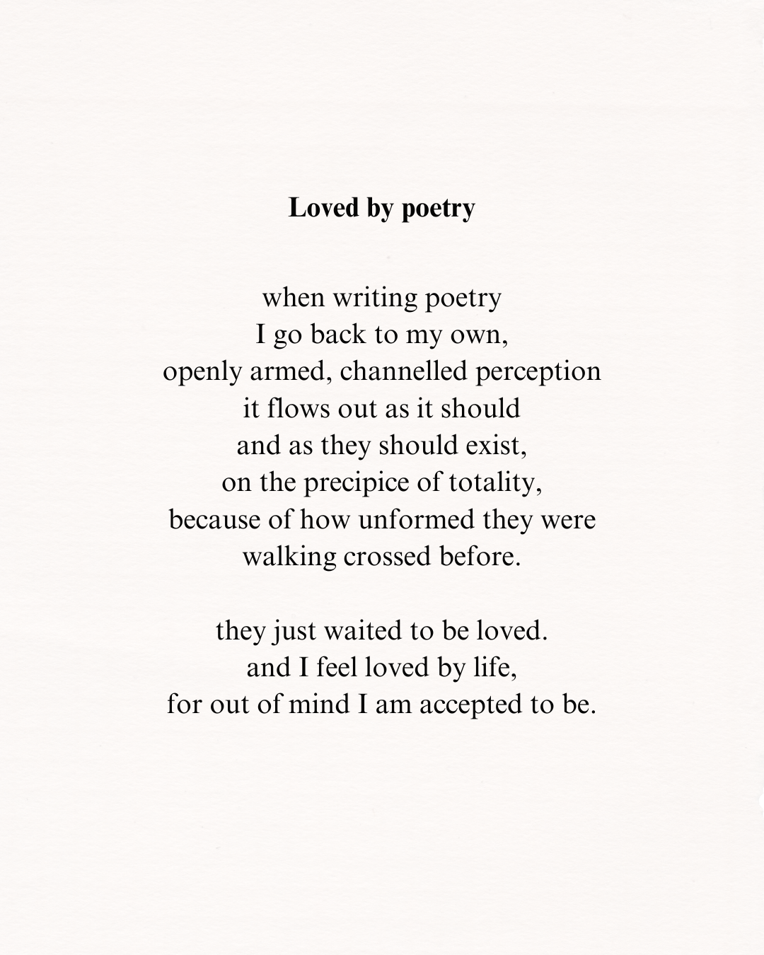 She writes abstractly and grounds this expression through down-to-earth cinematography in her poetry videos, shared on YouTube and across other platforms. Her writing functions as a form of inner expression, a practice that may appear chaotic from a distance, but ties things together from her mind revealed in the form of verses.
